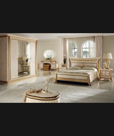 - Dormitorio modelo PDO0055, de estilo clásico hecho a medida, lacado en beige con detalles dorados. Compuesto por cama de matrimonio con piecero, dos mesitas, tocador con espejo y armario a juego