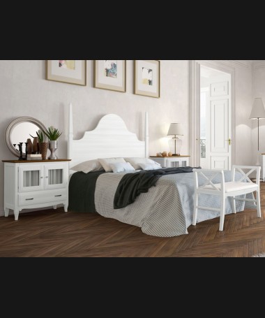 - Dormitorio modelo PDO0057, de estilo clásico hecho a medida, en madera decapado en blanco mate con detalles color madera, con cama de matrimonio, dos mesitas y descalzadora a juego
