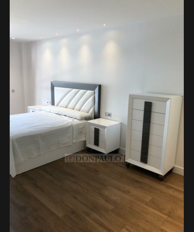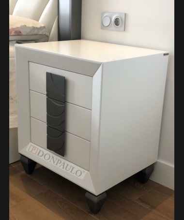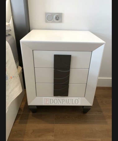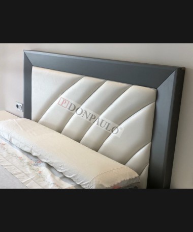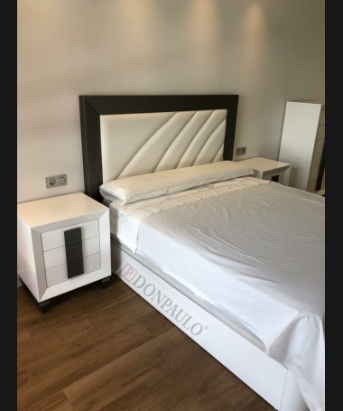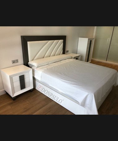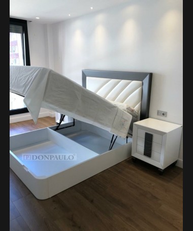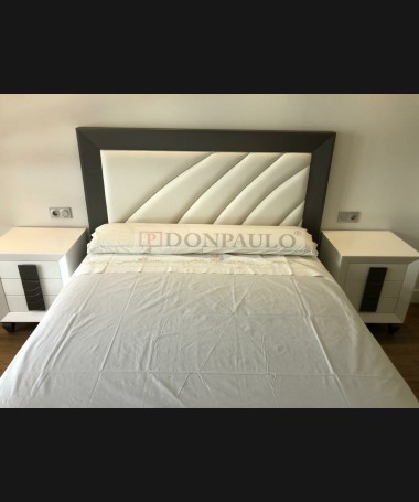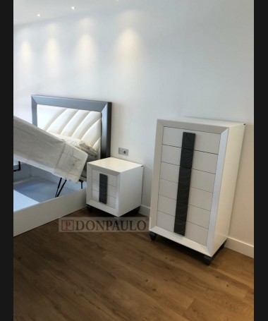 - Dormitorio modelo TDO0063, de estilo moderno hecho a medida, en madera en acabado decapado blanco con detalles en gris grafito. Compuesto por cama de matrimonio con canapé elevable y el cabecero tapizado. Dos mesitas, y sinfonier a juego