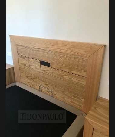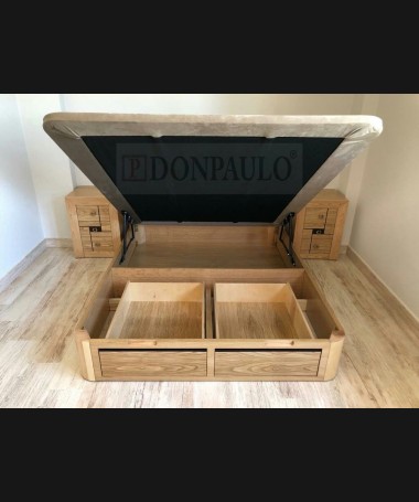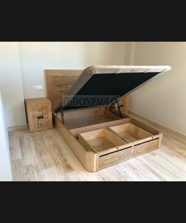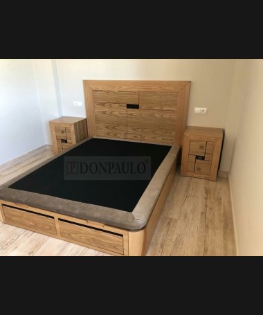 - Dormitorio modelo TDO0081, de estilo moderno hecho a medida, en madera de castaño en color roble con los detalles color chocolate. Compuesto por cama de matrimonio con cabecero, canapé elevable y dos cajones, y con dos mesitas