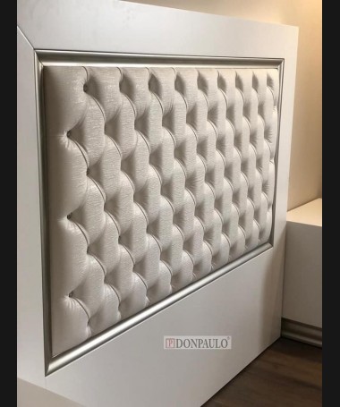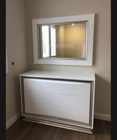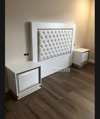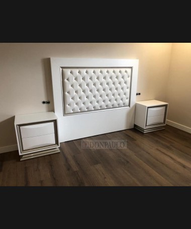 - Dormitorio modelo TDO0084, de estilo moderno hecho a medida, fabricado en dm hidrófugo lacado en blanco mate, con detalles plateados y el cabecero tapizado en polipiel con capitoné de botones de cristal. Compuesto por cabecero para cama de matrimonio, dos mesitas, cómoda y espejo