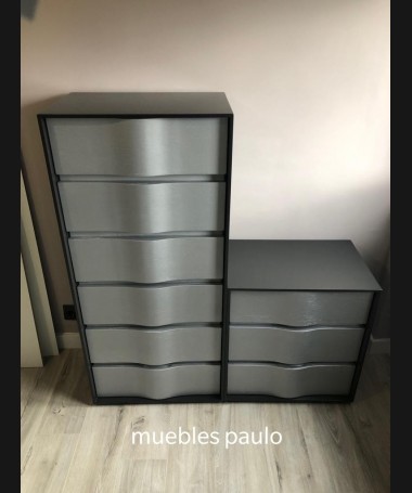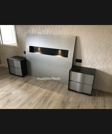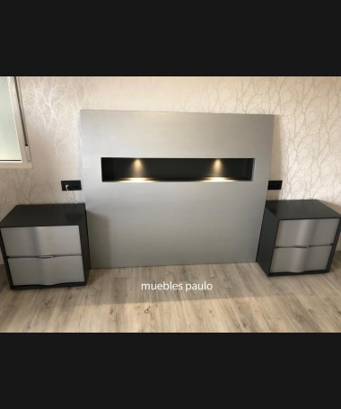 - Dormitorio modelo TDO0089, de estilo moderno hecho a medida, en madera en acabado decapado negro y gris plata, compuesto por cabecero con leds incorporados, dos mesitas, y sinfonier.