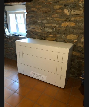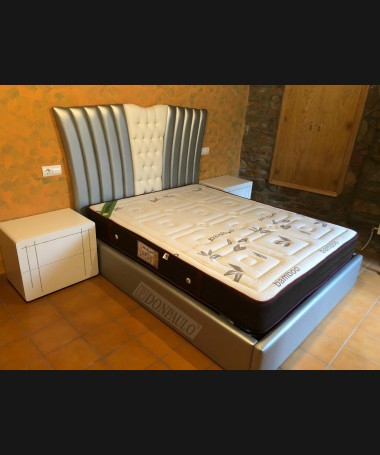 - Dormitorio modelo TDO0090, de estilo moderno hecho a medida, en dm hidrófugo lacado en blanco mate, con detalles de cristal, el cabecero y la cama tapizados. Compuesto por cama de matrimonio, dos mesitas, y cómoda.