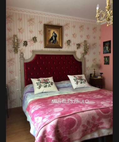 - Cabecero modelo TDO0096, de estilo clásico hecho a medida, en madera de cerezo en acabado efecto anticuario, tapizado en terciopelo granate con capitoné.