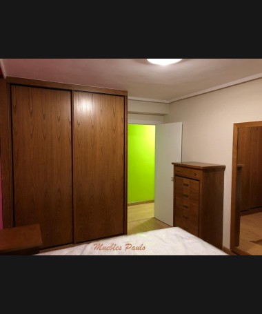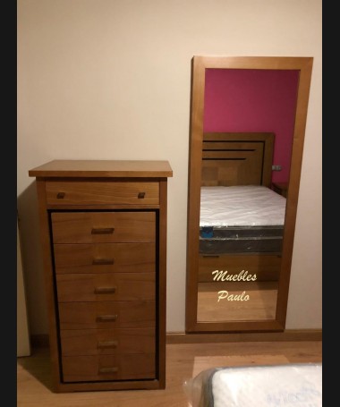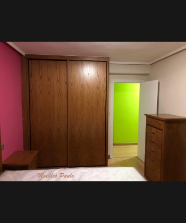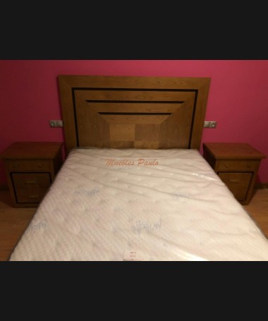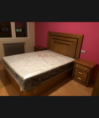- Dormitorio modelo TDO0098, de estilo moderno hecho a medida, en madera de castaño en color am con detalles en negro. Compuesto por cama de matrimonio con canapé elevable, dos mesitas, sinfonier con espejo y armario a juego.