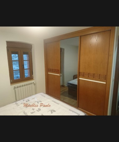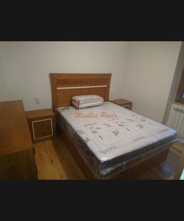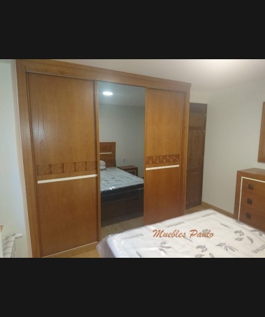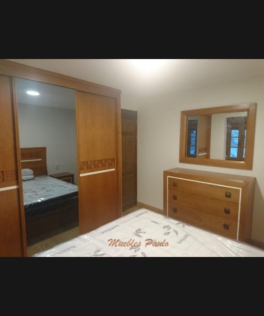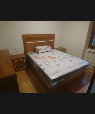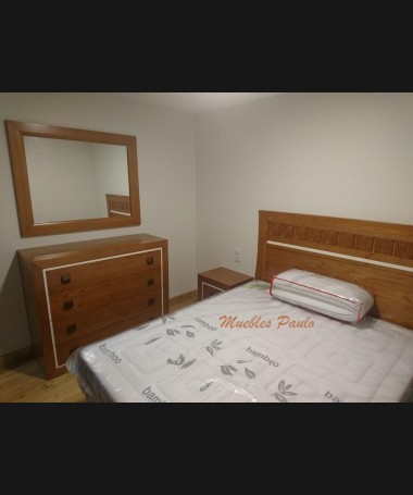 - Dormitorio modelo TDO0100, de estilo clásico hecho a medida, en madera de castaño en color AM, con detalles tallados y blancos, compuesto por: cama de matrimonio con canapé elevable, dos mesitas, cómoda, espejo y armario a juego.