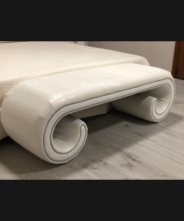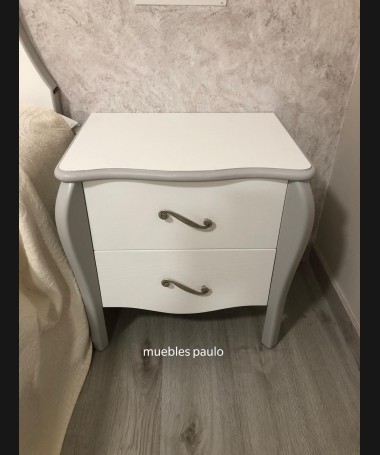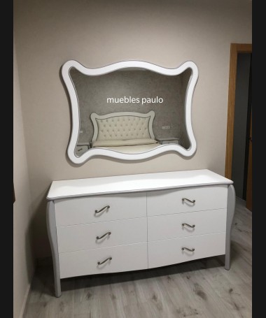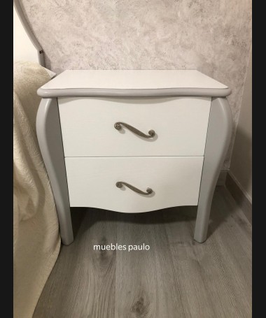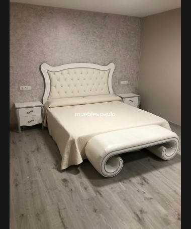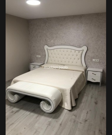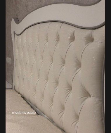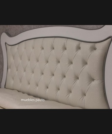- Dormitorio modelo TDO0026, en madera de castaño en acabado decapado blanco con detalles decapados en gris, cabecero con capitoné con botones de cristal, con tocador a juego todo ello hecho a medida