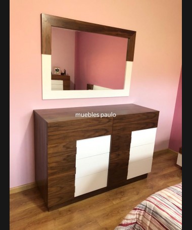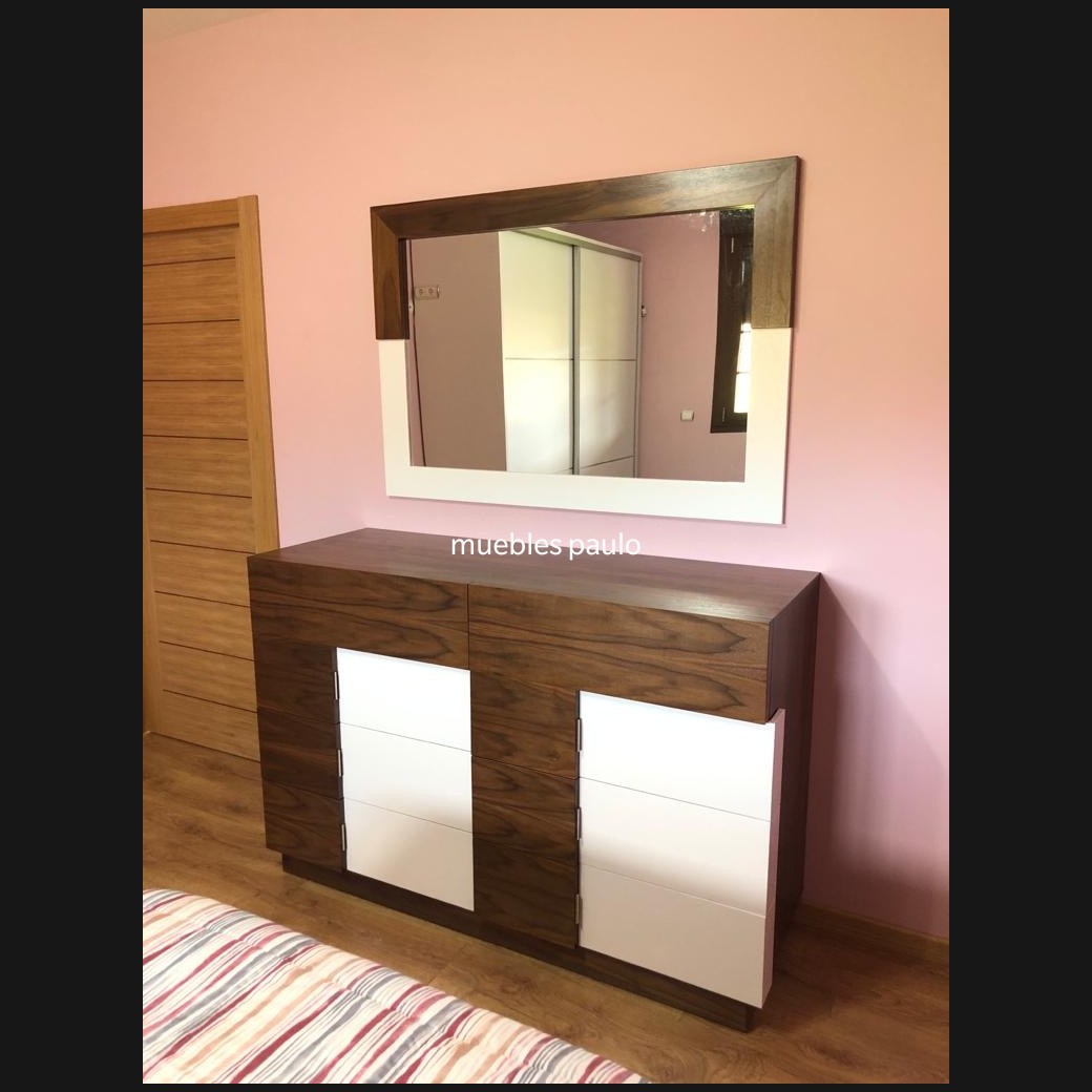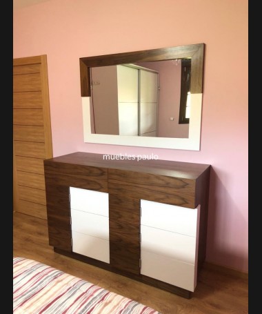 - Cómoda con espejo modelo TDO0029, en nogal y con detalles blancos, hecho a medida