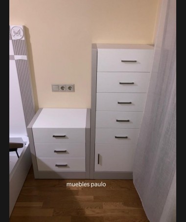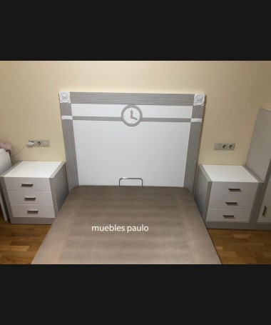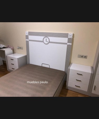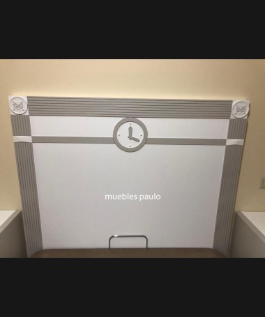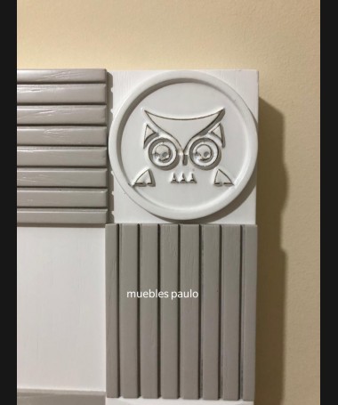 - Dormitorio modelo TDO0030, dormitorio en madera de castaño en acabado decapado en blanco con detalles en decape gris, y con detalles tallados de buda, unos buhos y un reloj, todo ello hecho a medida,