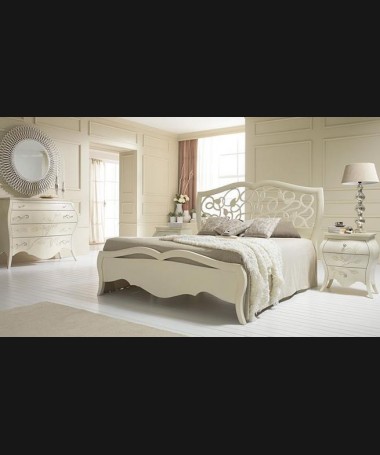 - Dormitorio modelo PDO0004, de estilo moderno hecho a medida, lacado en blanco roto, compuesto por cama de matrimonio, dos mesitas, cómoda y espejo a juego