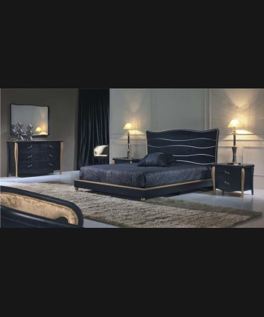 - Dormitorio modelo PDO0006, de estilo moderno hecho a medida, de madera en acabado decapado negro con los detalles en dorado, compuesto por cama de matrimonio, dos mesitas, cómoda y espejo a juego