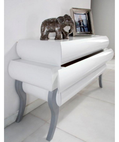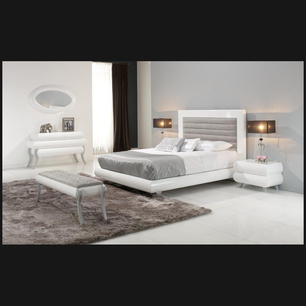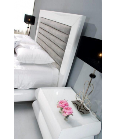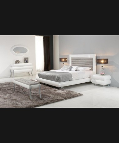 - Dormitorio modelo PDO0008, de estilo moderno hecho a medida, en acabado lacado blanco alto brillo con detalles en gris, compuesto por cama de matrimonio con el cabecero tapizado, dos mesitas, cómoda y espejo a juego; Y banqueta en el mismo modelo opcional