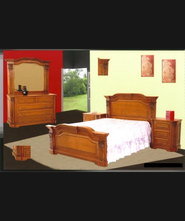 - Dormitorio modelo PDO0011, de estilo clásico hecho a medida, en madera de castaño maciza y tallada, compuesto por cama de matrimonio, dos mesitas, cómoda con espejo a juego