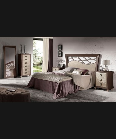 - Dormitorio modelo PDO0014, de estilo moderno hecho a medida, de madera en acabado decapado color chocolate y beige; compuesto por cama de matrimonio, dos medidas, sinfonier y espejo