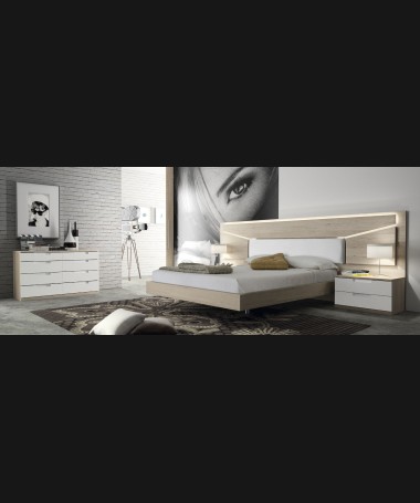 - Dormitorio modelo PDO0018, de estilo moderno hecho a medida, en madera y lacado blanco mate; compuesto por cama con cabecero corrido con leds, dos mesitas y cómoda a juego