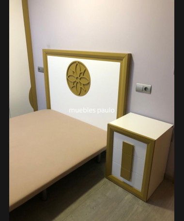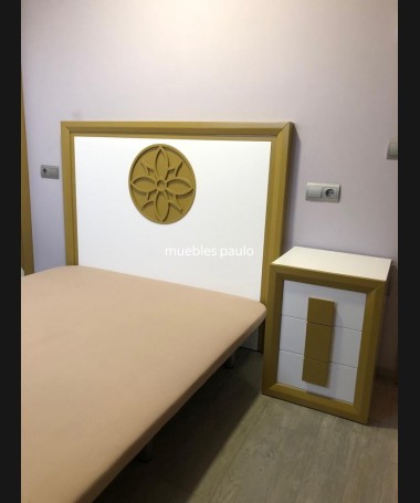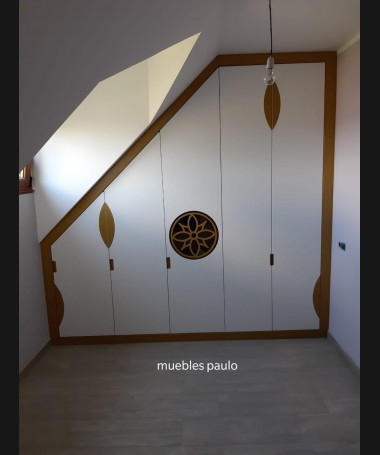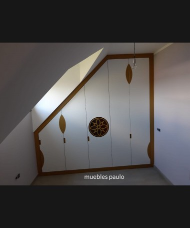 - Dormitorio modelo TDO0012, con armario a medida bajo-cubierta, en madera de castaño en acabado decapado blanco con detalles dorados, hecho a medida, con el interior del armario personalizado