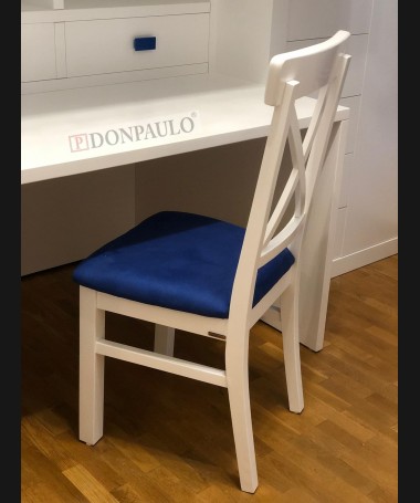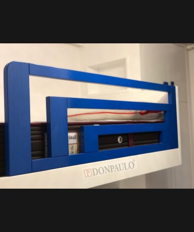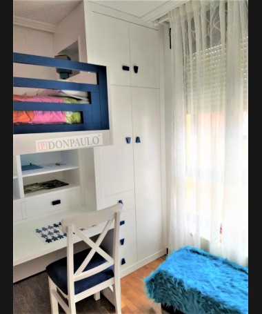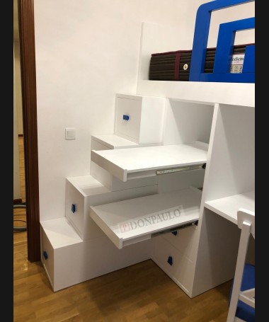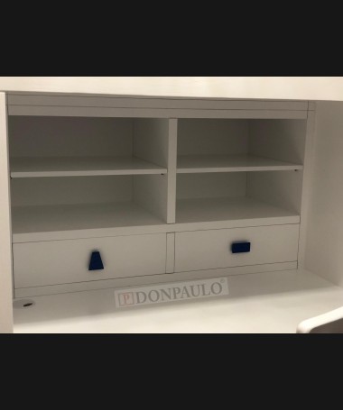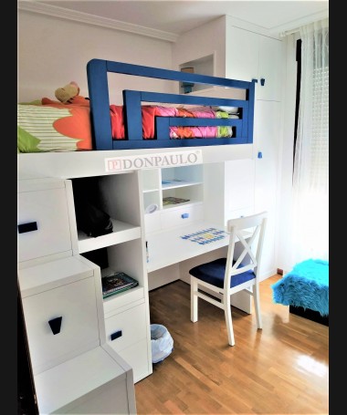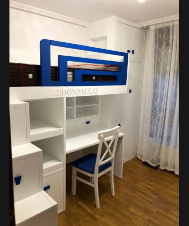 - Escritorio modelo TESC0027, de estilo moderno hecho a medida, en madera en decapé blanco con detalles y tiradores azules, debajo de la cama, con librería y baldas extraíbles, y silla