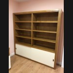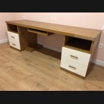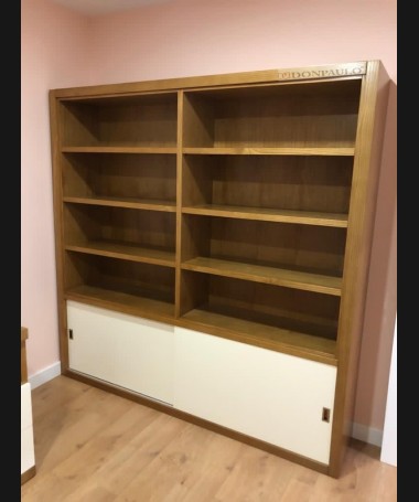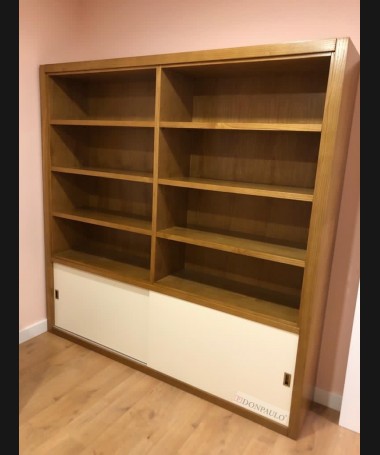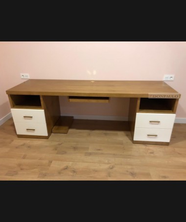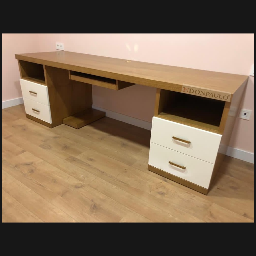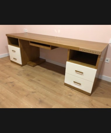 - Escritorio con librería modelo TESC0036, de estilo moderno hecho a medida, en madera color roble con los frentes decapados en blanco. Y librería a juego