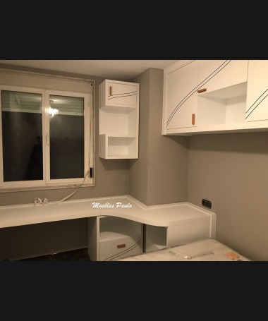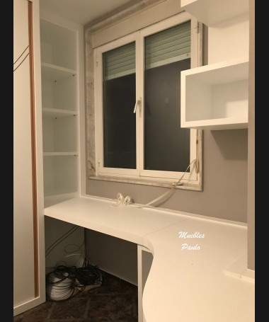 - Escritorio con librería modelo TESC0044, de estilo moderno hecho a medida, en forma de L, en madera, en acabado, decapado blanco con los detalles en color madera