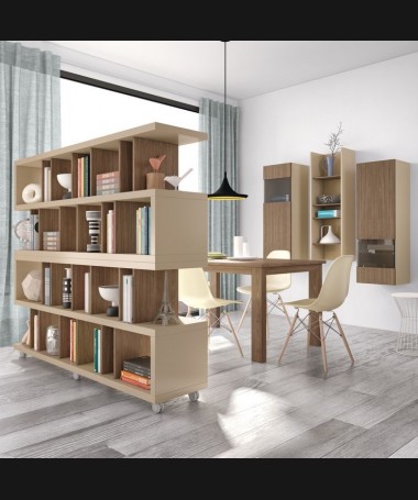 - Librería modelo PESC0038, de estilo moderno hecha a medida, en lacado beige y nogal, con ruedas