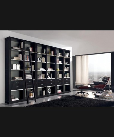 - Librería modelo PESC0002, de estilo moderno hecha a medida, en madera en color negro, con cajones y una escalera desplazable