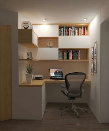 - Escritorio con librería modelo PESC0006, de estilo moderno hecho a medida, en madera de roble y lacado blanco, compuesto por mesa de escritorio con cajonera, y estanterías abiertas y cerradas