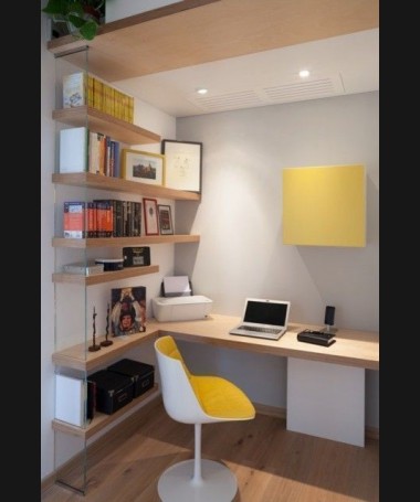 - Escritorio con librería modelo PESC0010, de estilo moderno hecho a medida, lacado blanco y color madera, con detalles de cristal, compuesto por mesa, y estantería