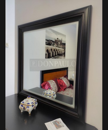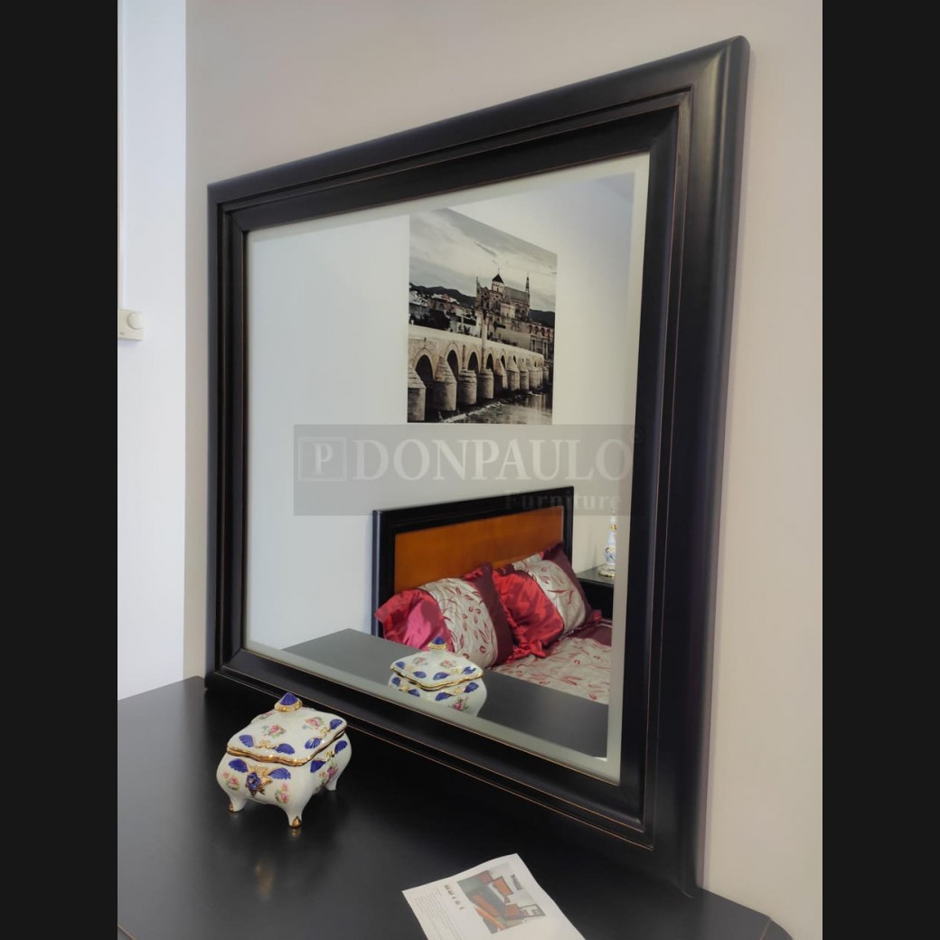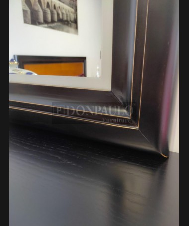 - Espejo modelo EES0030, de estilo clásico hecho a medida, en madera de castaño en acabado decapado negro desgastado. De L100 x F4 x A100 cm