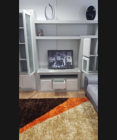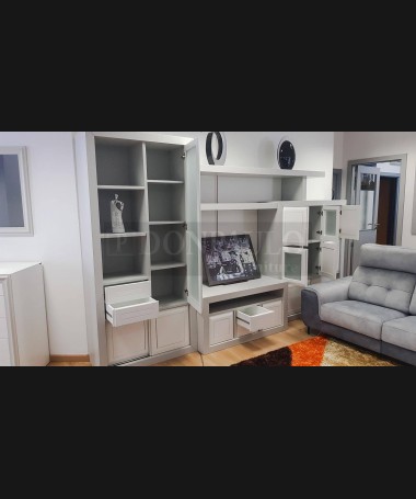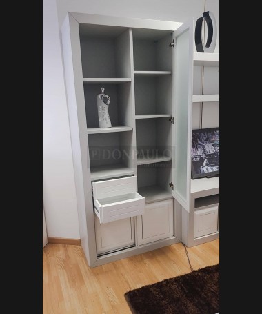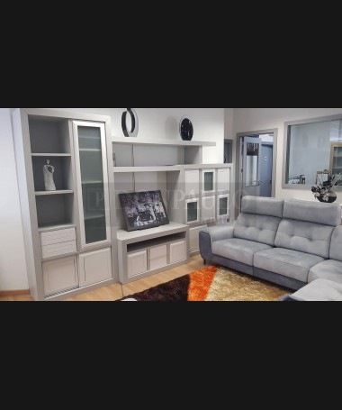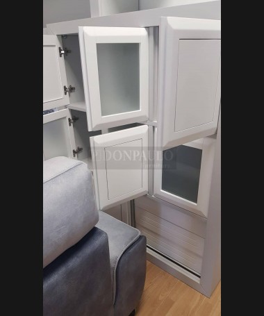 - Salón modelo ESA0059, de estilo moderno hecho a medida, en madera en acabado decapado gris, con los frentes en blanco, de L350 x F54 x A215 cm. Compuesto por: