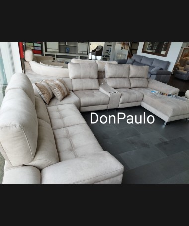 - Rinconera con chaisselonge modelo Lisboa ESO0101, de estilo moderno hecho a medida, con asientos de viscolatex y tapizado en tela de microfibras de fácil limpieza (Ref. EDA2 Beige con detalles en los cojines EDA3 Camel), con dos asientos con relax eléctrico, con módulo central con dos posavasos, cargador para el móvil y lámpara led. De L387 x F285 x A100 cm, con chaisselonge de F180 cm