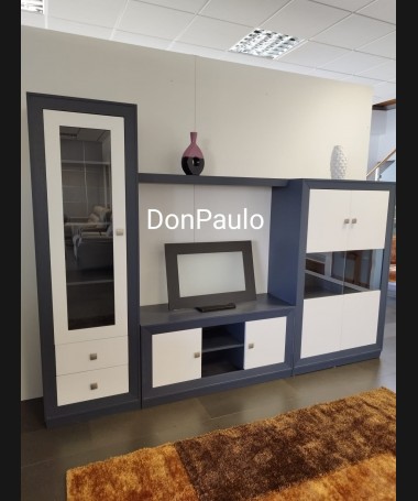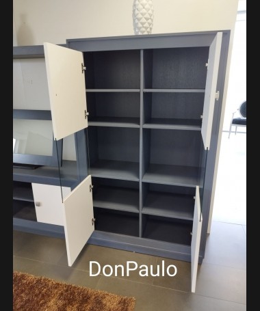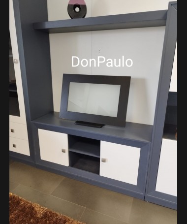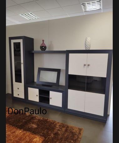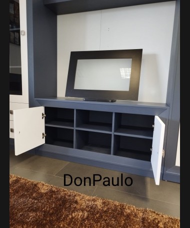 - Salón modelo ESA0062, de estilo moderno hecho a medida, en madera de castaño en acabado decapado gris antracita con los frentes en blanco. De L286 x F42 x A200,5 cm. Compuesto por: