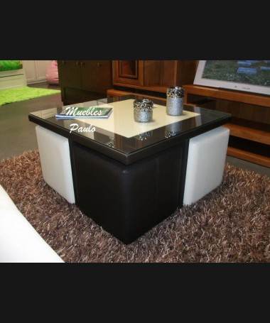 - Mesa de centro modelo EMC0011, tapizada en polipiel y cristal con 4 puffs a juego, de L88 x F 88 x A40 cm (los puffs miden L41 x F41 x A40 cm cada uno)