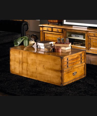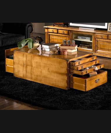 - Mesa de centro modelo PMC0035, de estilo clásico hecha a medida, en madera de cerezo en acabado efecto envejecido con muchos cajones