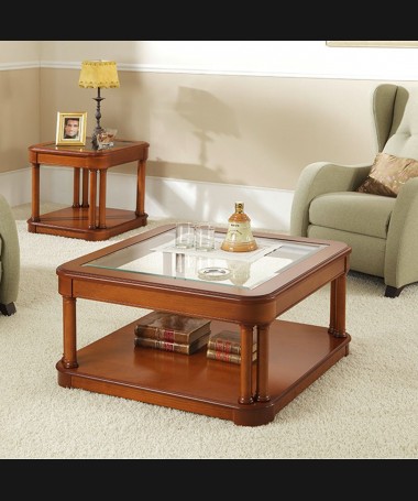 - Mesa de centro modelo PMC0049, de estilo clásico hecha a medida, de madera, con detalles tallados y torneados, con la tapa de cristal