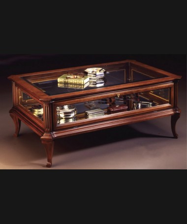 - Mesa de centro modelo PMC0051, de estilo clásico hecha a medida, fabricada en madera tallada, con la tapa de cristal y una balda de espejo