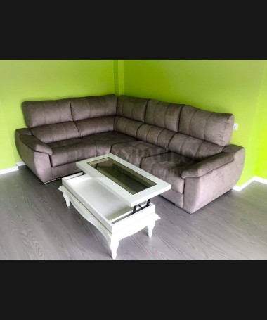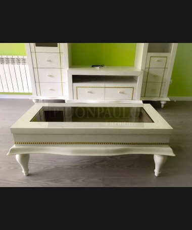 - Mesa de centro modelo TMC0052, de estilo clásico hecha a medida, en madera de castaño en acabado decapado blanco con la beta dorada, y la tapa de cristal ahumado y elevable