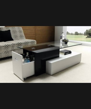 - Mesa de centro modelo PMC0008, de estilo moderno hecha a medida, lacada en blanco y negro, con la tapa de cristal y un cajón