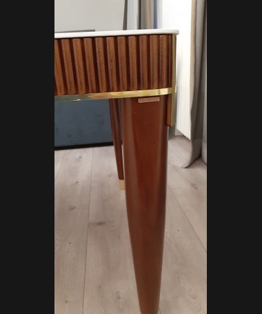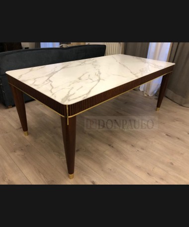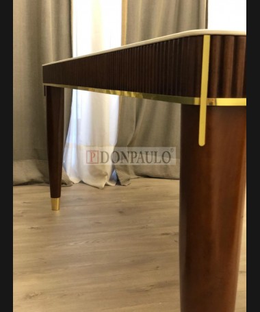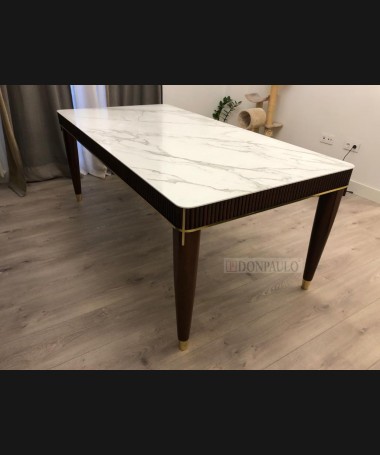 - Mesa de comedor modelo TM0007, de madera, con la parte de arriba de piedra y detalles dorados, hecha a medida