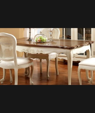 - Mesa de comedor modelo PM0001, de estilo clásico hecha a medida, en madera de cerezo en acabado blanco efecto anticuario con la tapa de color madera, con detalles tallados