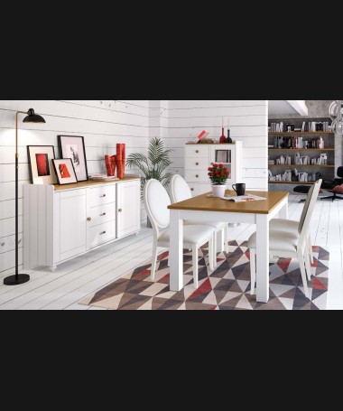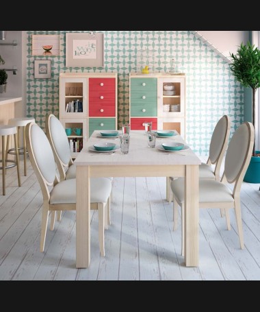 - Mesa de comedor modelo PM0009, de estilo clásico hecha a medida, en madera en acabado color madera y decapado blanco