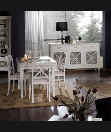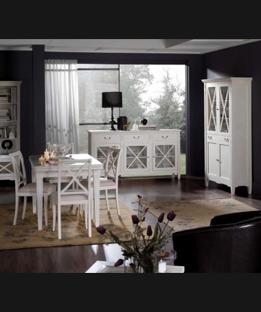 - Mesa de comedor modelo PM0011, de estilo clásico hecha a medida, en madera, en acabado decapado blanco roto envejecido extensible