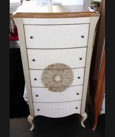 - Sinfonier modelo EAUX0001, de estilo clásico hecho a medida, en madera de cerezo tallada en acabado efecto anticuario en blanco roto, beige y color madera, con 5 cajones y patas altas. De L60 x F40 x A110 cm