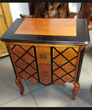 - Mesita modelo EAUX0002, de estilo clásico hecho a medida, en madera de cerezo con los detalles en negro en acabado efecto anticuario: Con dos cajones, de L70 x F43 x A76 cm