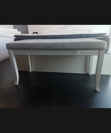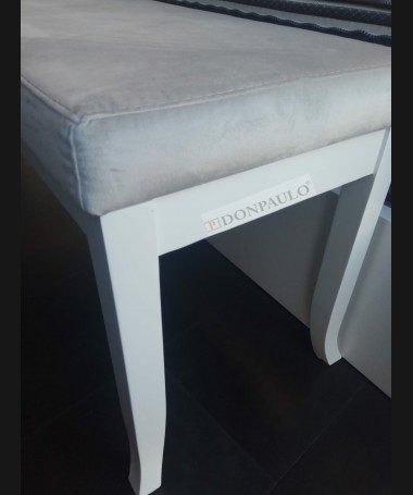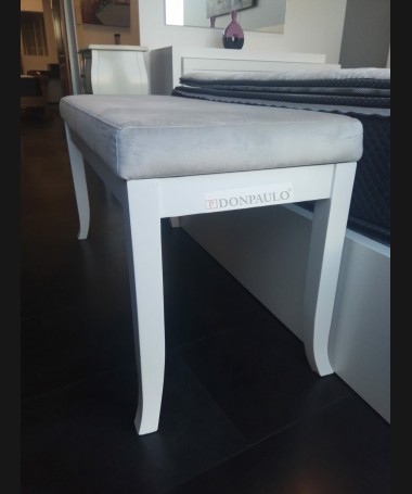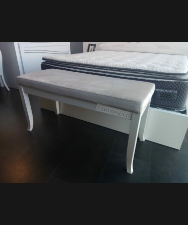 - Banqueta modelo EAUX0003, en madera en acabado decapado blanco, tapizado en tela de microfibras gris, de L100 x F42 x A52 cm