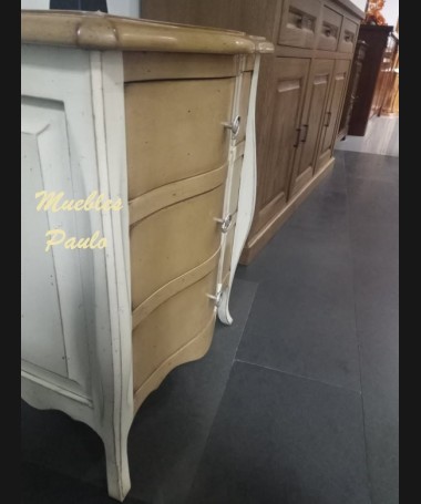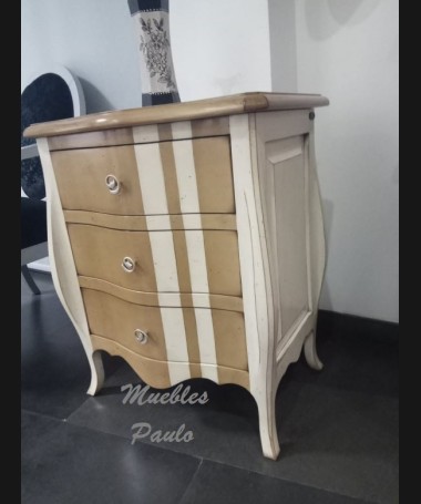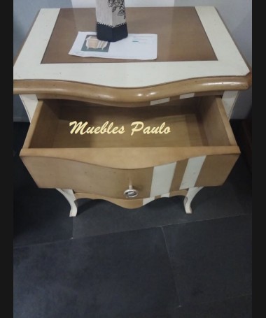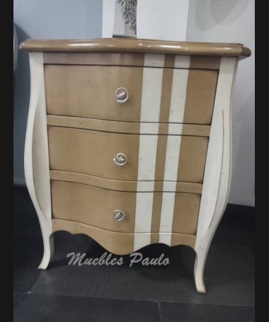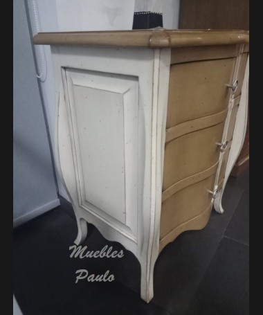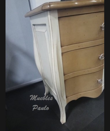 - Mesita modelo EAUX0010, de estilo clásico hecha a medida, en madera de cerezo en acabado efecto anticuario, en color madera claro y blanco roto; con tres cajones. De L57 x F43 x A70 cm