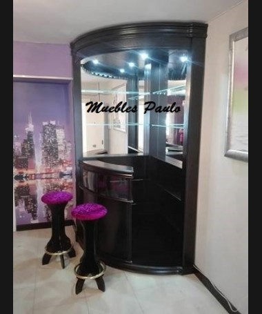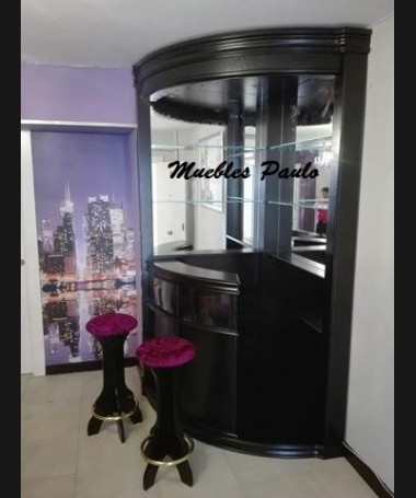 - Mueble bar modelo TMB0001, de estilo moderno hecho a medida, en madera en acabado decapado blanco, con dos taburetes altos a juego, y las estanterías con luces led