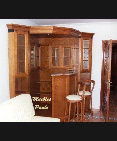 - Mueble bar modelo TMB0003, de estilo clásico hecho a medida, en madera en acabado color AM con los taburetes tapizados a juego