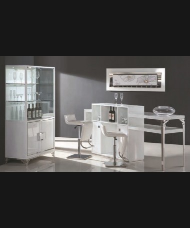 - Mueble bar modelo PMB0002, de estilo moderno hecho a medida, lacado en blanco alto brillo, con las patas de acero inoxidable cromado. Compuesto por la barra y la vitrina, taburetes no incluidos.