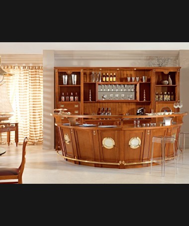 - Mueble bar modelo PMB0003, de estilo clásico hecho a medida, en madera de castaño, compuesto por la barra y el mueble bar trasero, los taburetes no incluidos