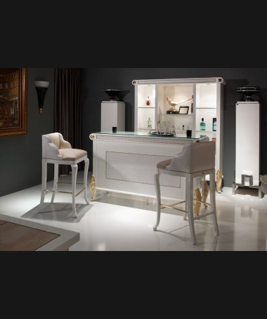 - Mueble bar modelo PMB0012, de estilo moderno hecho a medida, lacado en blanco y dorado y tapizado, con luces led, compuesto por barra con cristal por encima, mueble bar trasero, dos muebles columna con las patas metálicas, y dos taburetes a juego